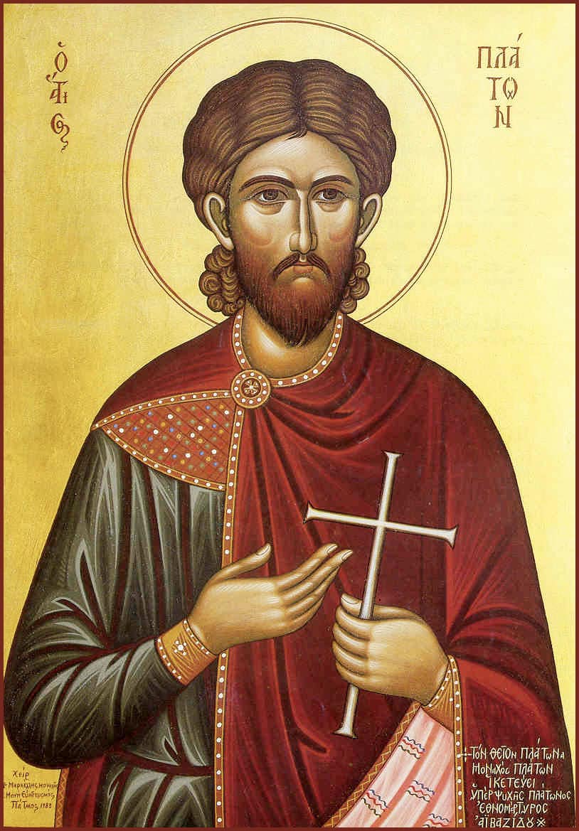 Святой мученик Платон, брат святого мученика Антиоха врача (память 29 июля), родился в городе Анкире в Галатии в благочестивой семье. Еще юношей он оставил дом и ходил по городам, вдохновенно проповедуя Слово Божие язычникам, удивляя слушателей убедительностью и красотой своих речей, глубоким знанием эллинской учености. За свою проповедь он был схвачен и приведен в храм Зевса на суд к правителю Агриппину. Судья вначале пытался лестью склонить святого к отречению от Христа. Он уверял юношу, что тот мог бы сравниться по уму с самим великим философом Платоном, если бы поклонялся языческим богам. На это святой Платон ответил, что мудрость философа, хотя и велика, но преходяща и ограниченна, а истинная, вечная и безграничная мудрость заключена в Евангельском учении. Тогда судья обещал в награду за отречение отдать ему в жены красавицу дочь, а в случае отказа угрожал мучением и смертью. Святой Платон ответил, что выбирает смерть временную ради жизни вечной. Терпение правителя иссякло, и он приказал нещадно бить мученика, а затем отправить в темницу.