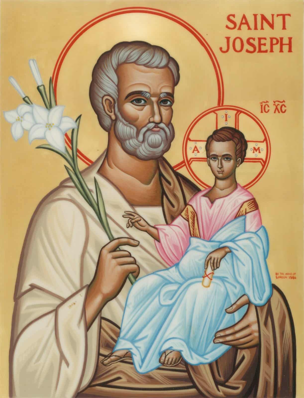 Святой Иосиф Обручник происходил из рода царя Давида. В первом браке у него было четыре сына и две дочери. Овдовев, святой Иосиф жил в строгом воздержании. Восьмидесятилетним старцем он был избран первосвященниками хранителем девства Пресвятой Богородицы, давшей обет безбрачия. О воплощении через Нее Сына Божия ему возвестил Ангел. Святой Иосиф присутствовал при поклонении пастырей Новорожденному Богомладенцу и при поклонении Ему волхвов. По указанию Ангела он бежал с Матерью Божией и Богомладенцем Иисусом в Египет, спасая Их от гнева царя Ирода. В Египте он жил с Девой Марией и Богомладенцем, зарабатывая на Их пропитание трудом плотника. Скончался святой Иосиф в возрасте около ста лет.