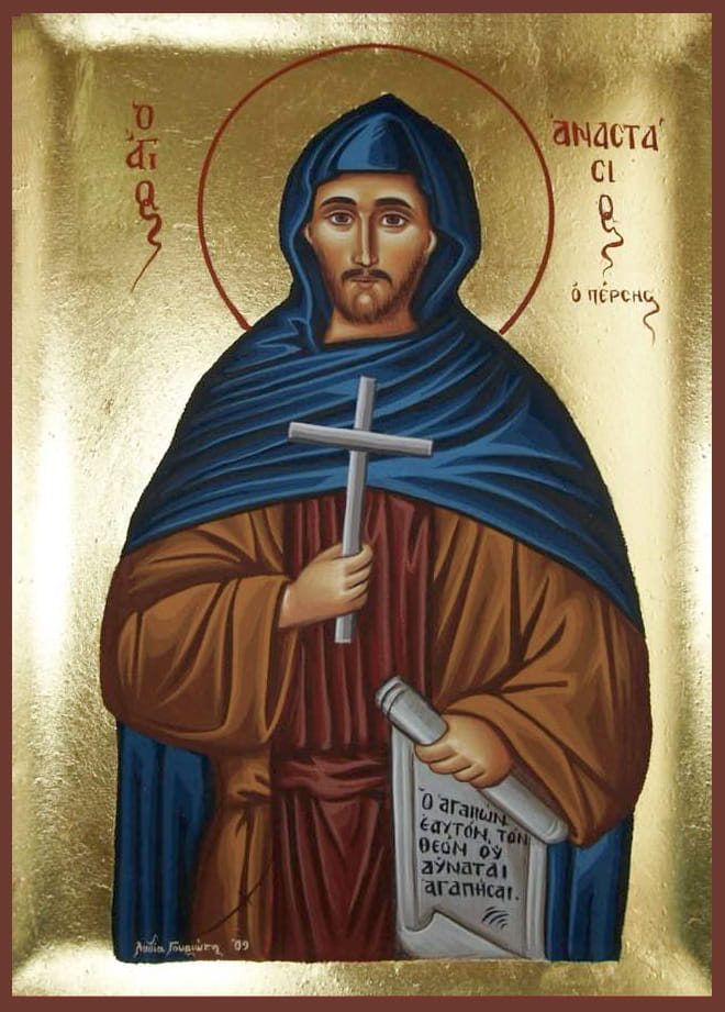 Родился в Персии. Отец его Вав был магом, знаменитым учителем чародейства, который обучил и сына своего. Анастасий, служа воином у персидского царя Хозроя, услышал о Животворящем Кресте Господнем, молва о славе и могуществе которого распространилась по всей Персии. Крестное древо изумляло необычными чудесами, так что многие говорили: «Бог Христианский пришел в Персию».