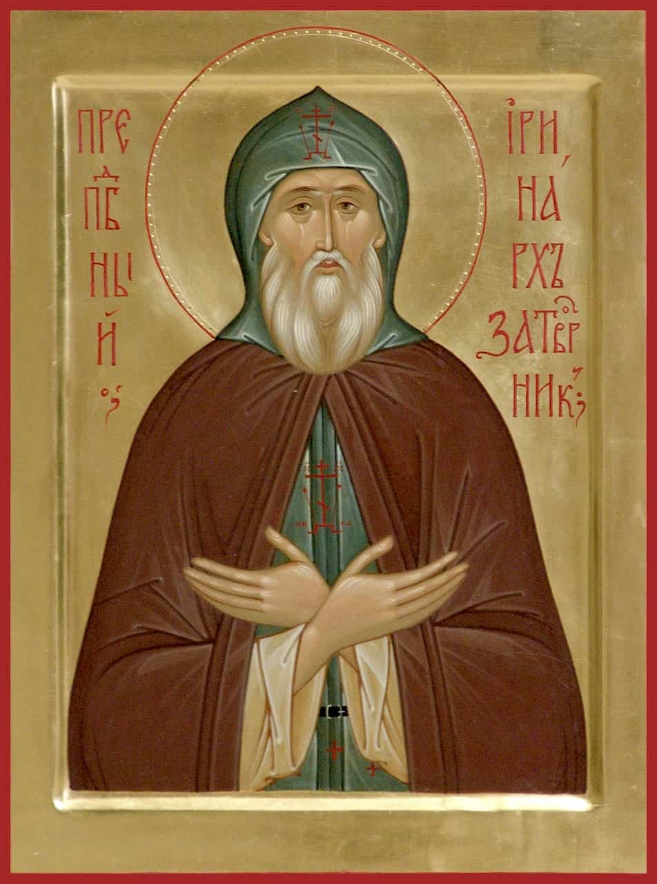 Преподобный Иринарх, затворник Ростовский, родился в крестьянской семье в селе Кондаково Ростовского уезда. В Крещении он получил имя Илия. На 30-м году жизни святой принял постриг в монашество в Ростовском Борисоглебском монастыре. Там он стал усердно трудиться в иноческих подвигах, посещал церковные службы, ночами молился и спал на земле. Однажды, сжалившись над странником, который не имел обуви, святой Иринарх отдал ему свои сапоги и с тех пор стал ходить босой по морозу. Игумену не понравилось такое поведение подвижника, и он начал смирять его, заставляя часа по два стоять на морозе против своей келлии или подолгу звонить на колокольне. Святой всё переносил с терпением и не изменил своего поведения. Игумен продолжал жестокосердствовать, и преподобный был вынужден перейти в Аврамиев Богоявленский монастырь, где был принят в число братии и вскоре был назначен келарем. Преподобный с усердием исполнял свое послушание, скорбя о том, что братия монастыря и служители не берегут достояние обители, расточая его без меры. Однажды во сне он увидел преподобного Авраамия Ростовского (память 29 октября), который утешил его и благословил раздавать всем потребное без смущения. Как-то во время пения Херувимской преподобный Иринарх громко зарыдал. На вопрос архимандрита он ответил: «Мать моя преставилась!» Оставив Авраамиев монастырь, преподобный Иринарх перешел в Ростовский монастырь святого Лазаря, поселился в уединенной келлии и прожил в ней три года в тесноте и голоде. Здесь его навещал блаженный Иоанн юродивый по прозванию Большой Колпак. Святые подкрепляли друг друга духовной беседой. Старец, однако, имел желание возвратиться в свою первоначальную обитель – Борисоглебский монастырь. Он был принят обратно с любовью строителем Варлаамом и стал еще более сурово подвизаться в обители. Уединившись в затворе, подвижник железной цепью приковал себя к деревянному стулу, наложил на себя тяжелые цепи и кресты. За это он переносил озлобление и насмешки от монастырской братии. В то время его навестил давний друг, блаженный Иоанн юродивый, предсказавший нашествие Литвы на Москву. 25 лет провел преподобный Иринарх закованным цепями и веригами в тяжелых трудах. Подвиги его обличали нерадиво живших в обители, и они солгали игумену, что старец учит не ходить на монастырские работы, а подвизаться подобно ему. Игумен поверил клевете и изгнал святого старца из обители. Смиренно покорившись, преподобный Иринарх опять ушел в Ростов и прожил в монастыре святого Лазаря один год. Между тем Борисоглебский игумен раскаялся в своем поступке и послал иноков за преподобным Иринархом. Он возвратился, укоряя себя, что живет не так, как братия, которая несет праведные труды, которых он лишен. Преподобный продолжал носить свои тяжкие вериги и, трудясь, изготовлял нищим одежду, вязал волосяные свитки и клобуки. Он спал ночью лишь один час или два, остальное же время молился и бил свое тело железной палкой.