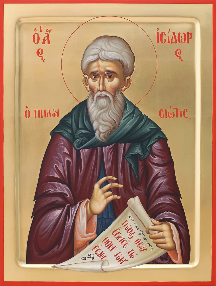 Преподобный Исидор Пелусиот жил в IV–V веках. Родом из Александрии. Вырос в среде благочестивых христиан. Он состоял в родстве с Феофилом, архиепископом Александрийским, и его преемником святым Кириллом. Еще юношей он покинул мир и удалился в Египет на Пелусиотскую гору, которая стала местом его иноческих подвигов. Духовная мудрость и строгий аскетизм преподобного Исидора в соединении с широкой просвещенностью и природным знанием человеческой души позволили ему в короткое время снискать уважение и любовь иноков. Они избрали его своим настоятелем и возвели в сан пресвитера. Следуя примеру святителя Иоанна Златоуста, которого ему довелось видеть и слышать во время путешествия в Константинополь, преподобный Исидор посвятил себя преимущественно христианской проповеди, той «практической философии», которая, по его собственным словам, является «основанием здания и самим зданием», в то время как логика «есть его украшение», а «созерцание – венец». Он был учителем и безотказным подателем советов для всех, кто обращался к нему за духовной поддержкой – будь то простой человек, вельможа, епископ, патриарх Александрийский или сам император. После него осталось около 10000 писем, из которых до нас дошло 2090. Большая часть этих писем содержит глубокие по богословской мысли и вместе нравственно назидательные толкования Священного Писания. Здесь преподобный Исидор выступает как лучший ученик святителя Иоанна Златоуста. Любовь и преданность преподобного Исидора к святому Иоанну Златоусту проявились в решительных действиях в защиту святого Иоанна во время гонения на него императрицы Евдоксии и архиепископа Феофила. После смерти святителя преподобный Исидор убедил преемника Феофила, святого Кирилла Александрийского, вписать имя святого Иоанна Златоуста в церковные диптихи как исповедника. По инициативе преподобного Исидора был созван III Вселенский Собор в Ефесе (431), на котором было осуждено лжеучение Нестория о Лице Иисуса Христа.