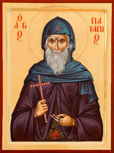 В Египте на реке Ниле был город, называвшийся Фивы. В этом городе родился блаженный Патапий. Родители его были христиане и воспитали своего сына в благочестии и страхе Божием. Достигнув совершеннолетия, он презрел суету мира сего и, оставив дом свой, родителей и друзей, принял иночество. Удалившись в пустыню Египетскую, он жил для Бога, подвизаясь в посте, молитвах и многоразличных отшельнических трудах. Когда о нем узнали и многие стали приходить к нему и прославлять его за добродетельную жизнь, он восскорбел, что безмолвие его нарушается и что его хвалят уста человеческие. Оставив Египет, он пришел в Константинополь. Здесь он затворился в келлии, устроив ее близ Влахерн, при городской стене, и пребывал в безмолвии, как бы в пустыне, никем неведомый, кроме Единого Бога, беседуя только с Богом в непрестанной молитве. Но как не может укрыться город, стоящий на вершине горы, так не может находиться в неизвестности и человек добродетельный, достигший совершенной святости. Сам Бог прославляет прославляющих Его и исполнившихся благодати Его и открывает другим на пользу. Так и сей муж, совершенный в святости и обильно наделенный благодатью чудотворения, открываемый и прославляемый Богом, скоро был обретен, как сокровище, сокрытое на поле. Ибо один христианский юноша, будучи слеп от рождения, руководимый Самим Богом пришел к келлии преподобного отца Патапия и просил блаженного помолиться Богу о даровании ему зрения, дабы видеть всё творение Божие и от него приходить в совершеннейшее познание Самого Творца и прославлять Его. Преподобный, видя его веру, умилосердился над ним и сказал: