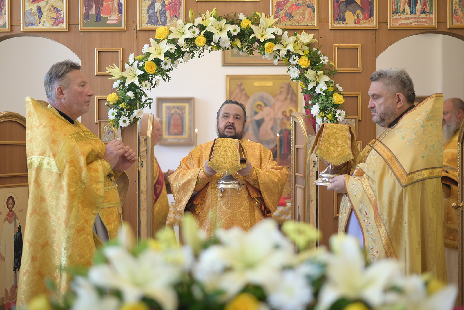 Епископ Авксентий поздравил духовенство и прихожан храма с престольным праздником и обратился ко всем присутствующим со словом назидания. Владыка поздравил причастников с принятием Святых Христовых Таин, после чего вручил именинникам иконки и цветы.