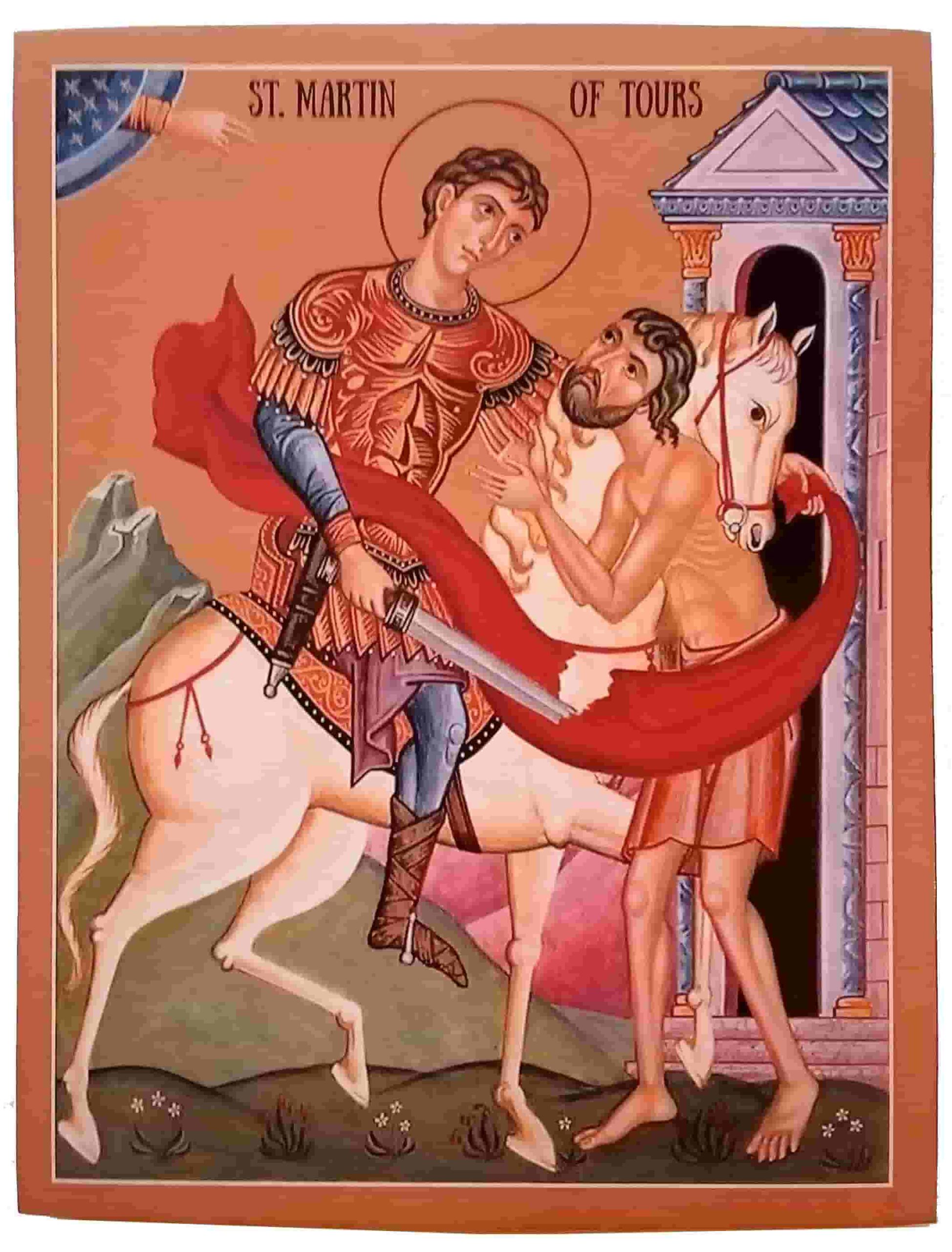 Святитель Мартин Милостивый, епископ Турский, жил во Франции. Он назван Милостивым за свою благотворительность и попечение о бедных. До принятия монашества Мартин был военачальником при императоре Юлиане Отступнике (361–363) и отличался храбростью. Когда варвары напали на империю, по приказу императора святой Мартин со своим отрядом вышел из города, чтобы сразиться с ними. Встретив на дороге нищего, он отдал ему свою одежду. Ночью святому явился Господь Иисус Христос и пообещал победу над неприятелем, что вскоре и свершилось. Император торжественно встретил победителя и предложил ему принести жертву идолам в благодарность за одержанную победу. Но святой Мартин сказал, что хочет принести жертву Христу, с помощью Которого победил врагов, и стать иноком. Император отпустил святого. Через семь лет подвижнической жизни святой Мартин был поставлен епископом Турским. Святитель Мартин имел дар прозорливости и чудотворений. Скончался он в конце IV века.