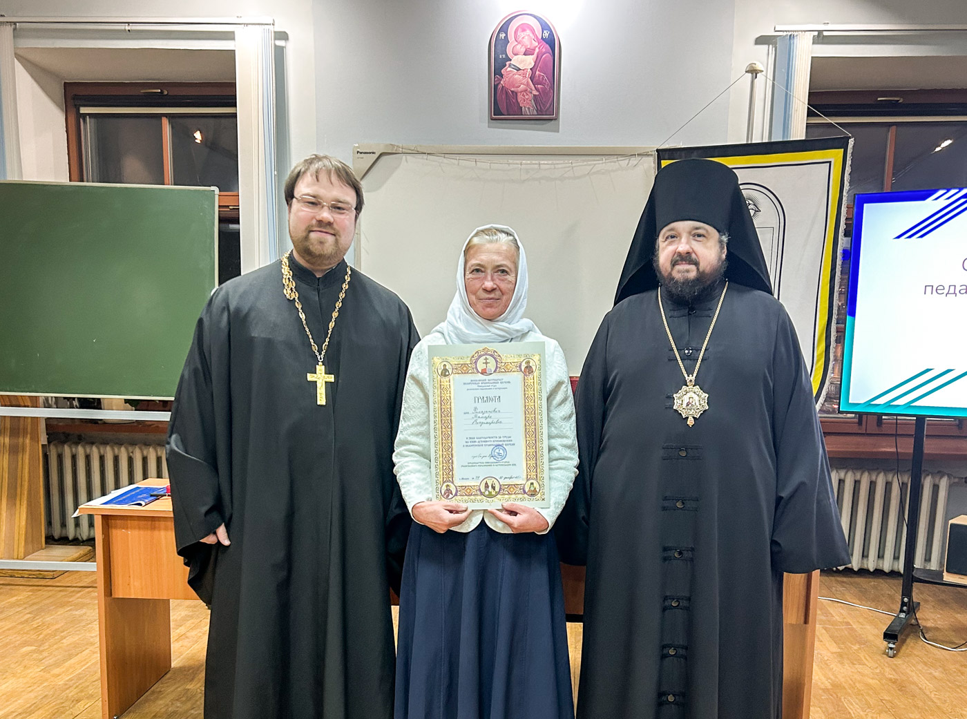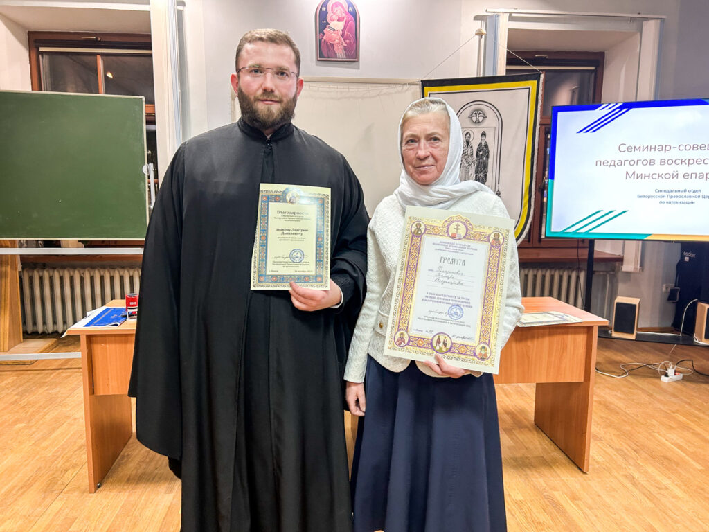 В рамках семинара состоялось награждение педагогов и священнослужителей, внесших значительный вклад в дело катехизации и духовного просвещения. За многолетний труд на ниве духовного просвещения учащихся воскресной школы в приходе храма святителя Николая Чудотворца п. Привольный, а также за труды в деле катехизации преподавателей и учащихся ГУО «Привольненская средняя школа» грамотой была награждена Тамара Владимировна Филазапович.